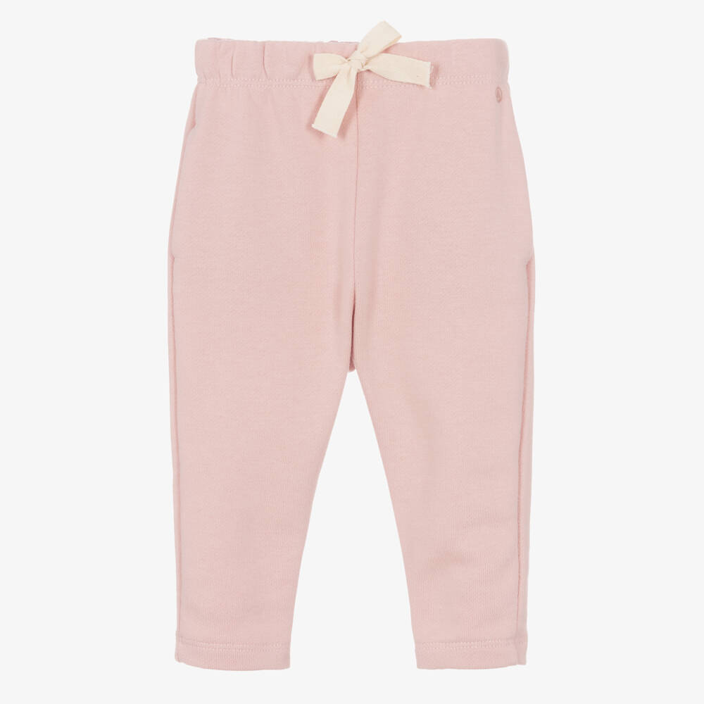 Dusky pink trousers for baby girls from Petit Bateau, made in soft organic cotton jersey. These comfortable trousers have a gently elasticated waistband with a faux tie detail and concealed side seam pockets. A small logo print on the front gives them a subtle designer finish.
