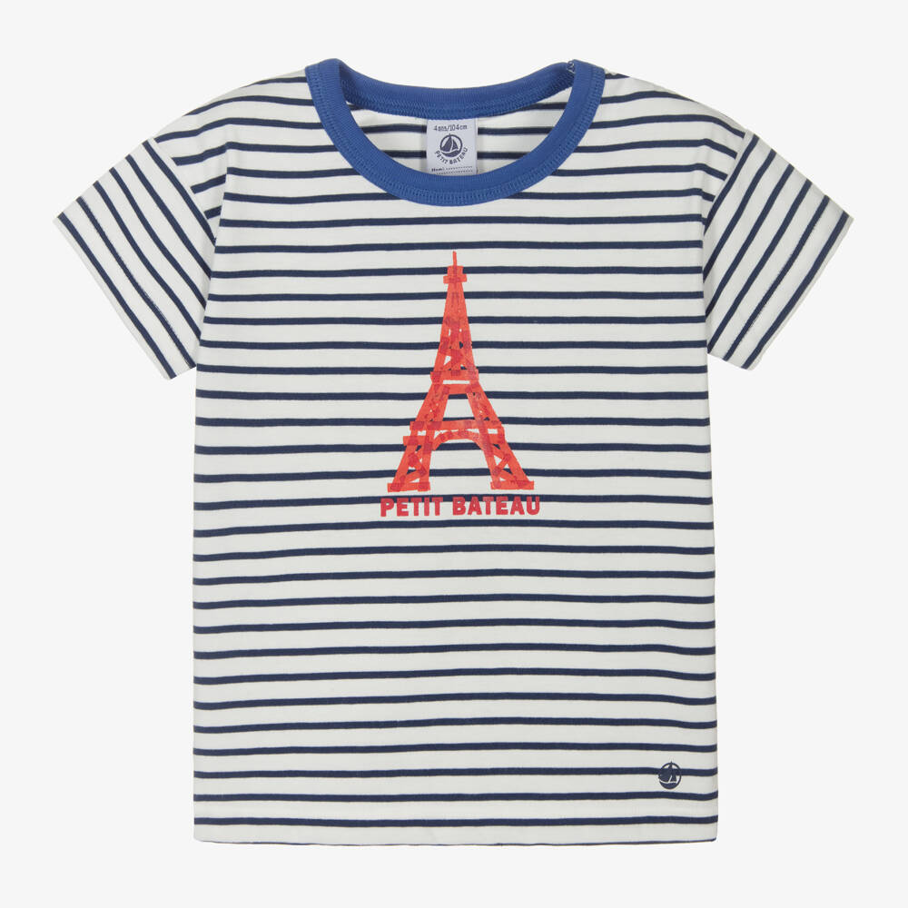 A navy blue and white organic cotton T-shirt for boys and girls by Petit Bateau, made in soft, stretchy jersey. A celebratory design for the much-awaited 2024 Paris Olympic Games, this striped T-shirt has a red Eiffel Tower print on the front. The brand's sailing boat logo is printed above the hem, completing the look.