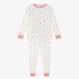 Blue and white pyjamas for boys and girls by Petit Bateau, patterned in the French brand's Milleraise stripes. Snug fitting, they are made in beautifully soft organic cotton jersey with contrasting red striped cuffs and a logo print on the chest.