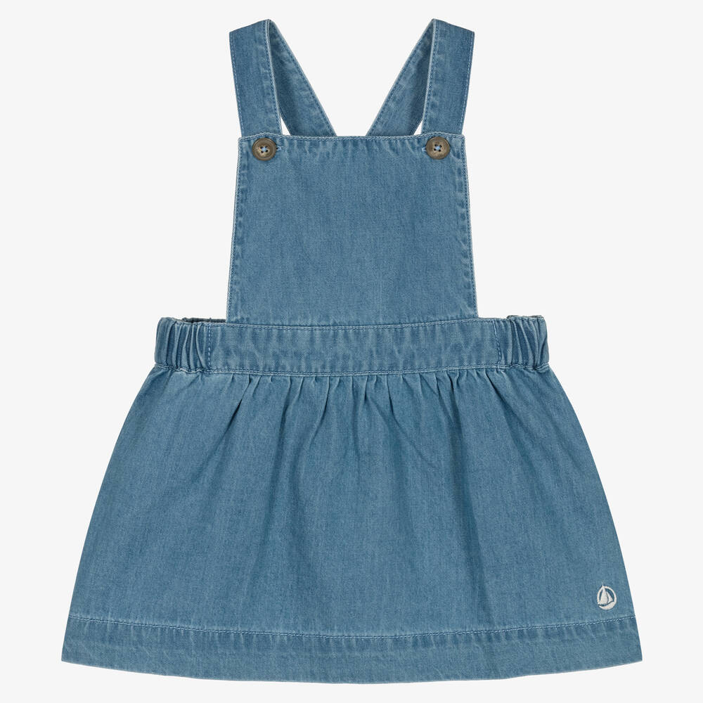 Mid-blue denim pinafore dress for little girls by classically-styled French brand Petit Bateau. Made in soft, organic cotton, the waistband is elasticated on the sides for a comfortable fit and the cross-over shoulder straps have adjustable button fastenings. The designer's logo is embroidered in white by the hemline.