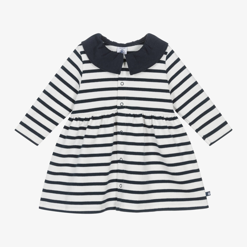 A classically styled white and navy blue dress for little girls by Petit Bateau, knitted in soft organic cotton jersey. Defined by the Breton stripe, this dress has a frilly collar and a delicate flowy hemline. Practical poppers fasten effortlessly on the front.