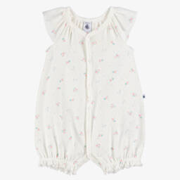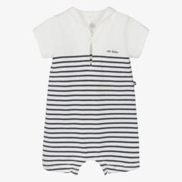 Ivory shortie for baby boys and girls by Petit Bateau, made in organic cotton with dark navy blue Breton stripes. This jersey babysuit has a sailor-style neckline and a sailboat motif printed on the chest. Popper fastenings are concealed between the legs for easy changes.