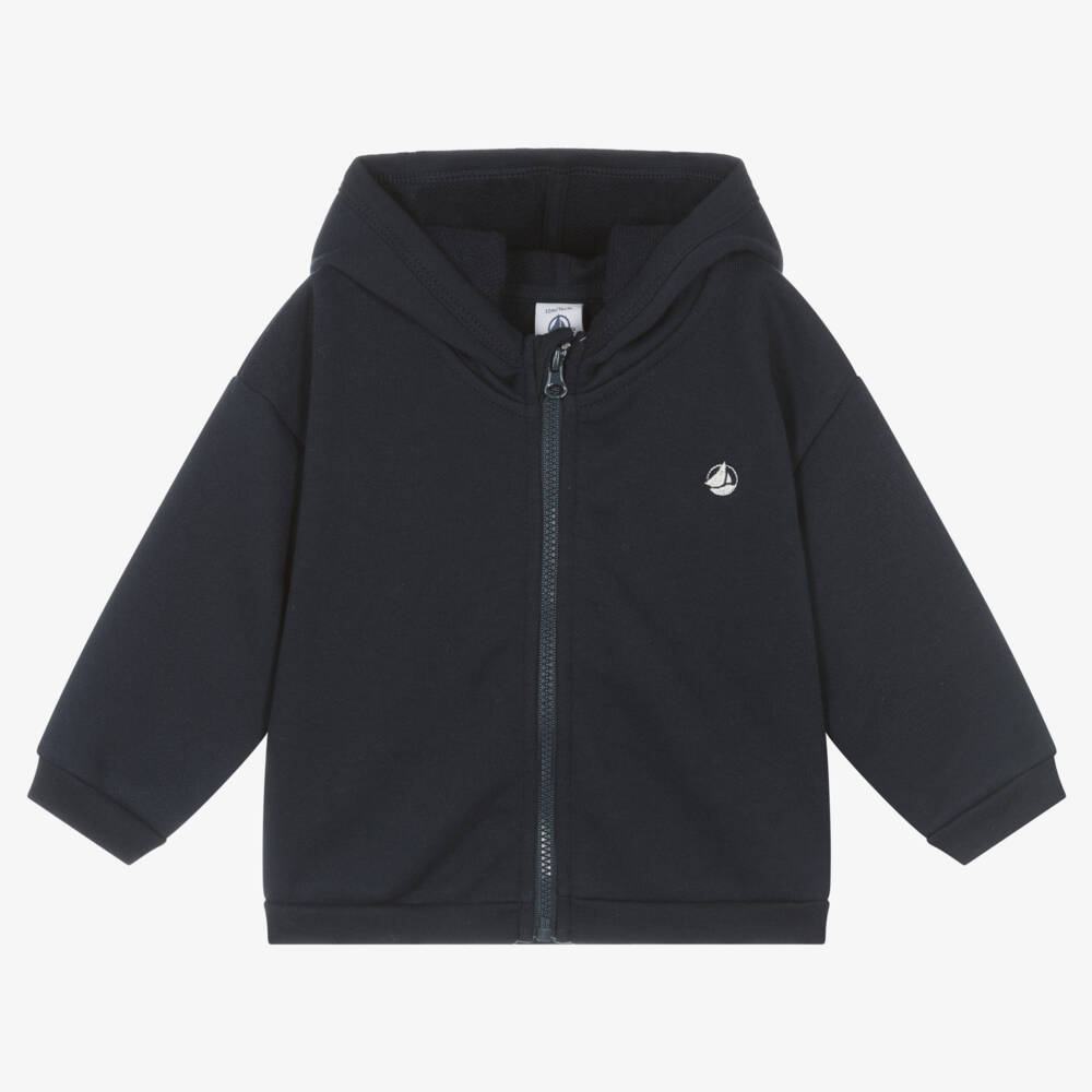 Navy blue zip-up hooded top for little boys and girls from French brand, Petit Bateau. Made in super soft and comfortable organic cotton jersey, it has the designer's embroidered logo on the chest in white.