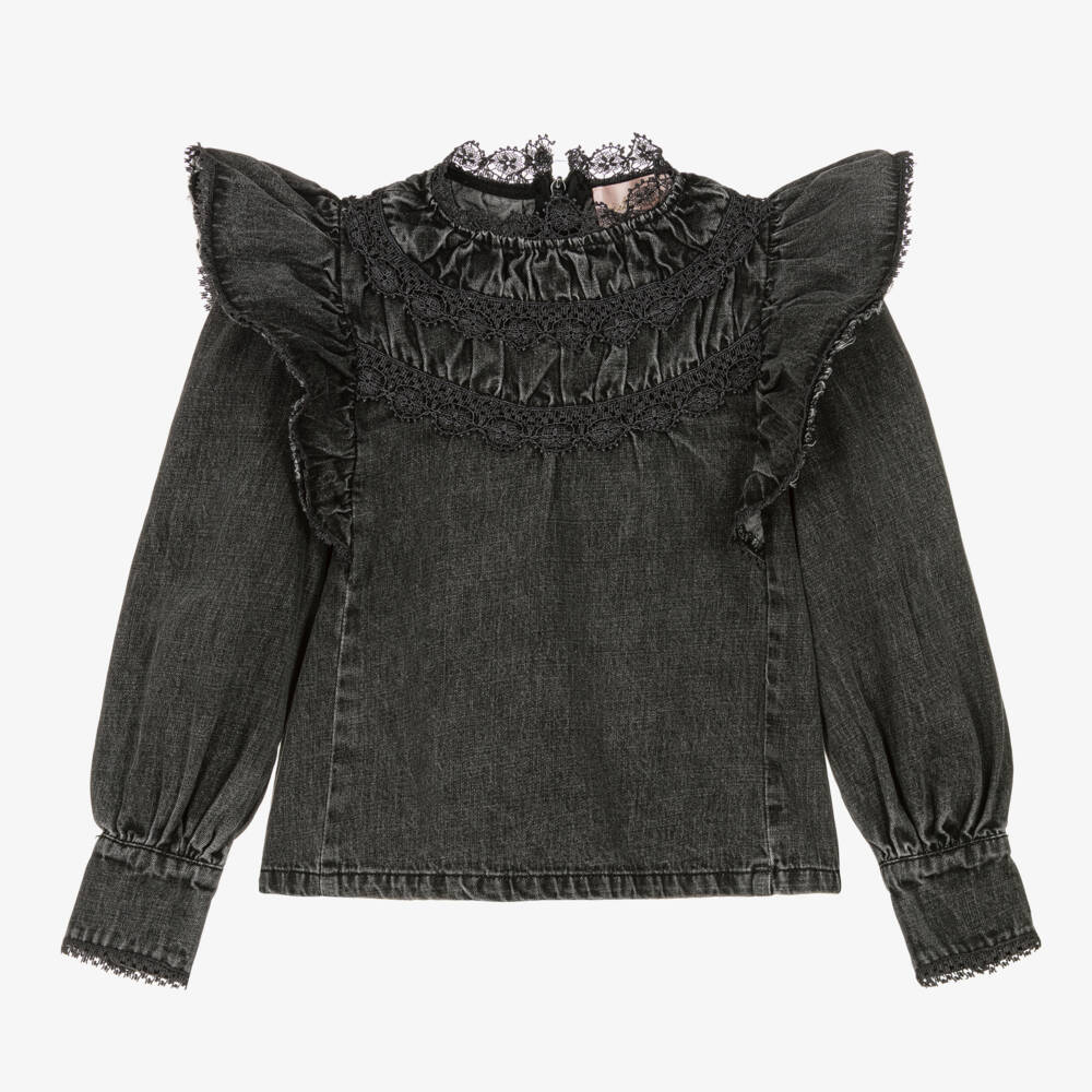 Black denim blouse for girls by Australian brand Petite Amalie, with a light, washed finish. Styled with a traditional look, it has ruffle trims on the shoulders and cotton lace trims on the collar. Coordinating floral details can also be seen on the front and back for a lovely finishing touch. It has a concealed zip fastening on the back and button fastenings on the barrel cuffs.