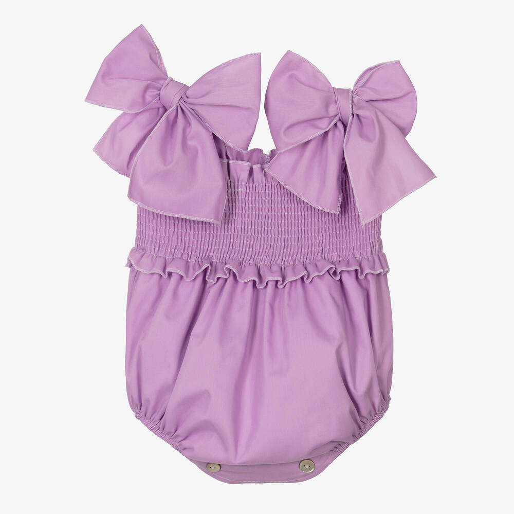 In a lovely shade of purple, this shortie for baby girls is by Phi Clothing. Made from smooth woven fabric with a partial lightweight lining, it has a shirred bodice with pretty frilled detailing. Utterly charming, the straps tie into statement bows on the shoulders for a feminine look. There are mother-of-pearl button fastenings between the legs to help with dressing.