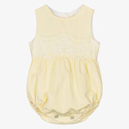 Очаровательный жёлтый песочник для девочек от классического бренда Phi Clothing с эффектными оборками на рукавах, украшенными белым кружевом, и большими фиксированными бантами спереди. Изготовлен с подкладкой из мягкого, комфортного хлопка, идеально подходит для тёплой погоды, создавая стильный образ для особых случаев или добавляя элегантности повседневному гардеробу.