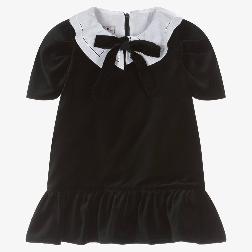 A black occasion dress for girls by Phi Clothing. With a white cutwork voile collar, this lovely dress is made in beautifully soft cotton velvet for comfort and a smart look. It has a sweet ruffle hem, velvet bow on the neckline, and a ruffle hem. On the back is a hidden zip fastening for a neat and seamless finish.