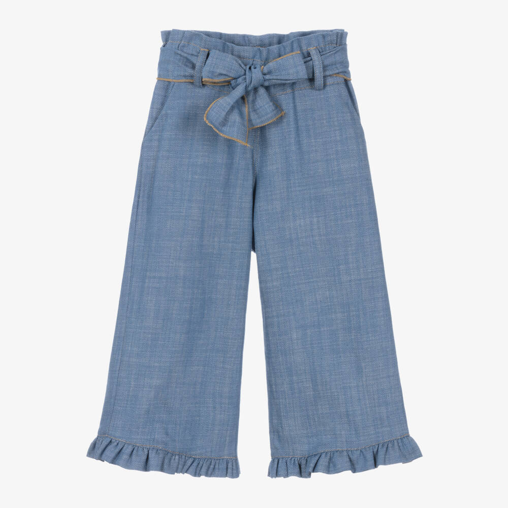 Blue wide-leg trousers for girls by Phi Clothing, woven in lightweight cotton chambray. Girly and cute, they have a tie-up fastening belt around the waist and lovely frills on the cuffs.