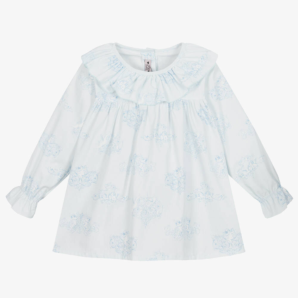 Sweet pale blue cotton blouse for girls by Portuguese brand Phi Clothing, with a sweet cherub pattern. Made in soft poplin, it has a large, ruffled collar and long sleeves with gently elasticated, frilled cuffs. Gathered and full below the bodice, it fastens with a single, mother-of-pearl button around the back.