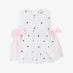 Lovely aqua blue blouse for girls by Phi Clothing, made in lightweight cotton poplin. Patterned in a gorgeous pink floral print, this top has dramatic large ruffle trims across the front and back, trimmed with intricate lace detailing. There is a single button fastening on the back.