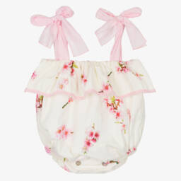 Adorable, ivory and black polka dot shortie for baby girls by Phi Clothing. Made in soft cotton poplin, it has dramatic ruffle sleeves and a black bow to tie on the back for a cute, statement look. It is fully lined and has mother-of-pearl button fastenings between the legs.