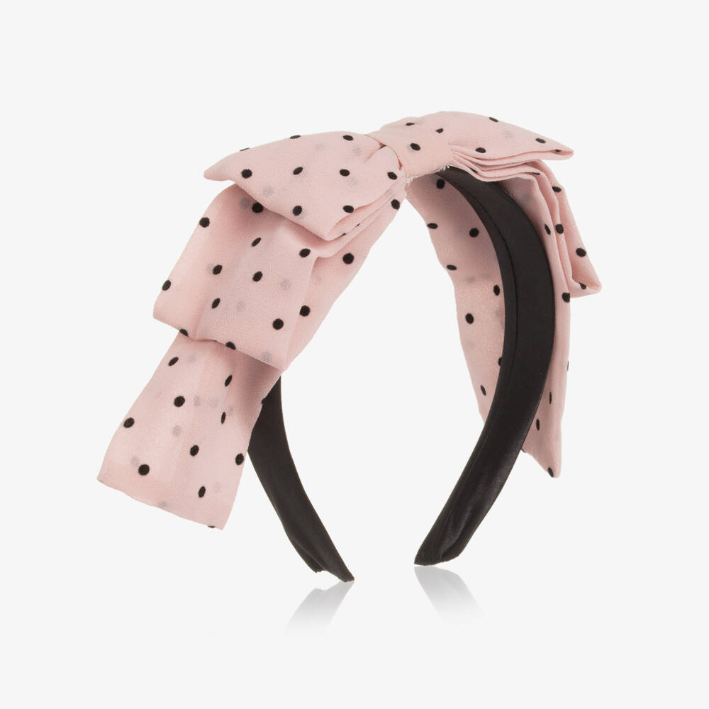 Black and pink headband for girls by Phi Clothing. It features a charming crêpe chiffon bow, patterned in playful polka dots that add a touch of whimsy. The flexible band is covered in silky black satin for comfort, whilst also complementing the black polka dots.