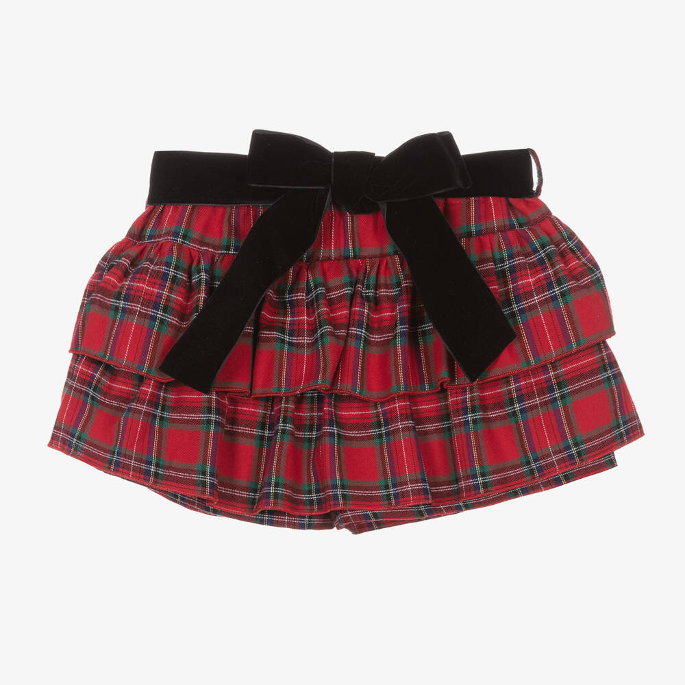 Red and green tartan skort for girls by classic Portuguese designer Phi Clothing, with a removable, black velvet ribbon belt that ties in a pretty bow. Made in soft, lightweight cotton twill, it has tiered, gathered frills all around and a gently elasticated waistband.