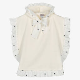 Pretty white T-shirt for girls by Phi Clothing, made in soft and stretchy cotton jersey. Comfortable and easy wearing, it has short sleeves made in layers of white ruffled cotton poplin for a statement girly finish. Smaller sizes have popper fastenings on the back.