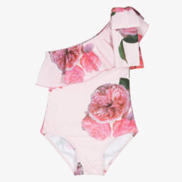 A beautiful, ruffle-trimmed swimsuit for girls by Phi Clothing, in pastel yellow with a vibrant pink and green floral print. Made from silky, stretchy fabric and fully lined for comfort, it features a stretchy neckline, allowing it to be worn off the shoulder.
