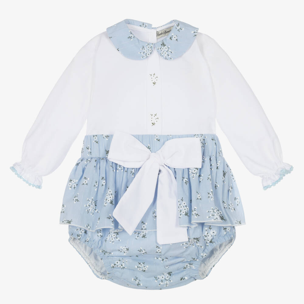 Charming sky blue and white short set for little girls by Piccola Speranza. Fastening with poppers on the back, the white poplin blouse has a rounded collar, patterned in a dainty floral print with a glitter stripe weave, pale blue pom pom trims and flowers printed on the decorative placket. The matching cotton shorts have a frill trim and an oversized bow on the front, and the leg holes and waist are elasticated for comfortable wear.