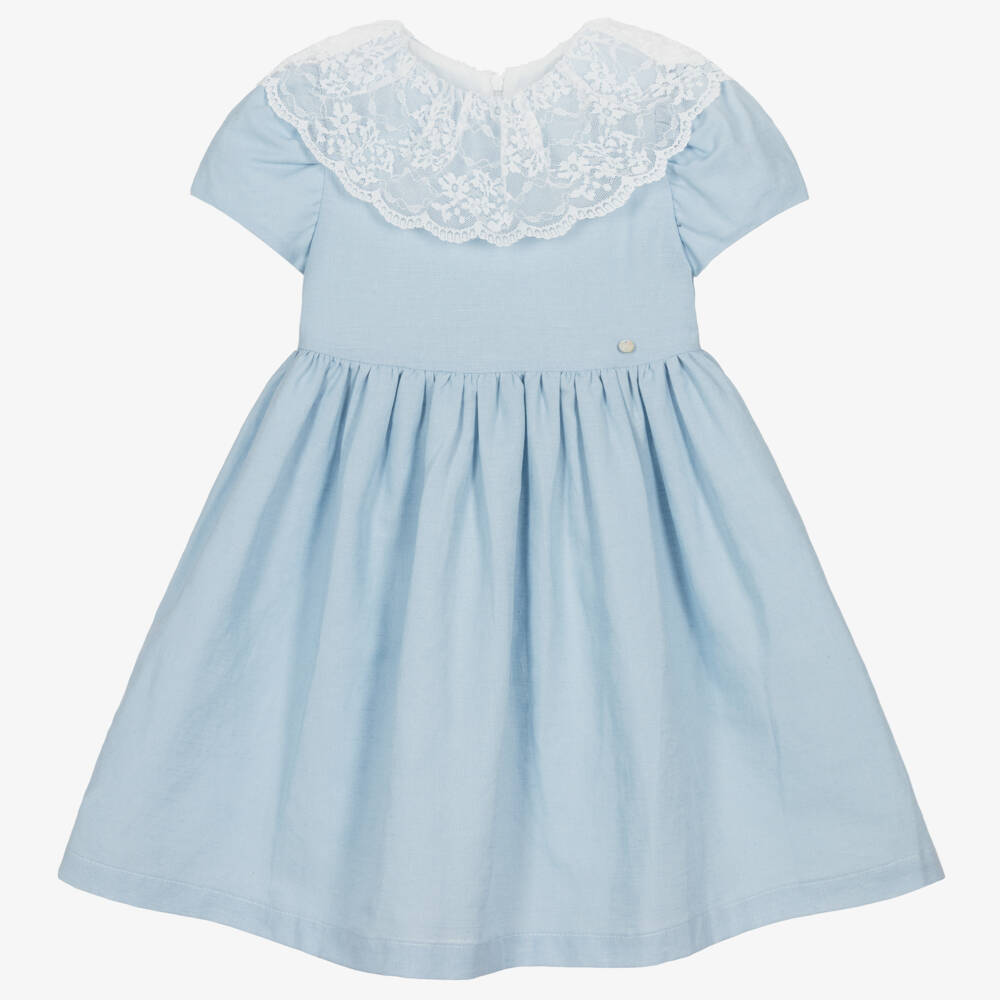 Голубое льняное платье с кружевным воротником для девочек
