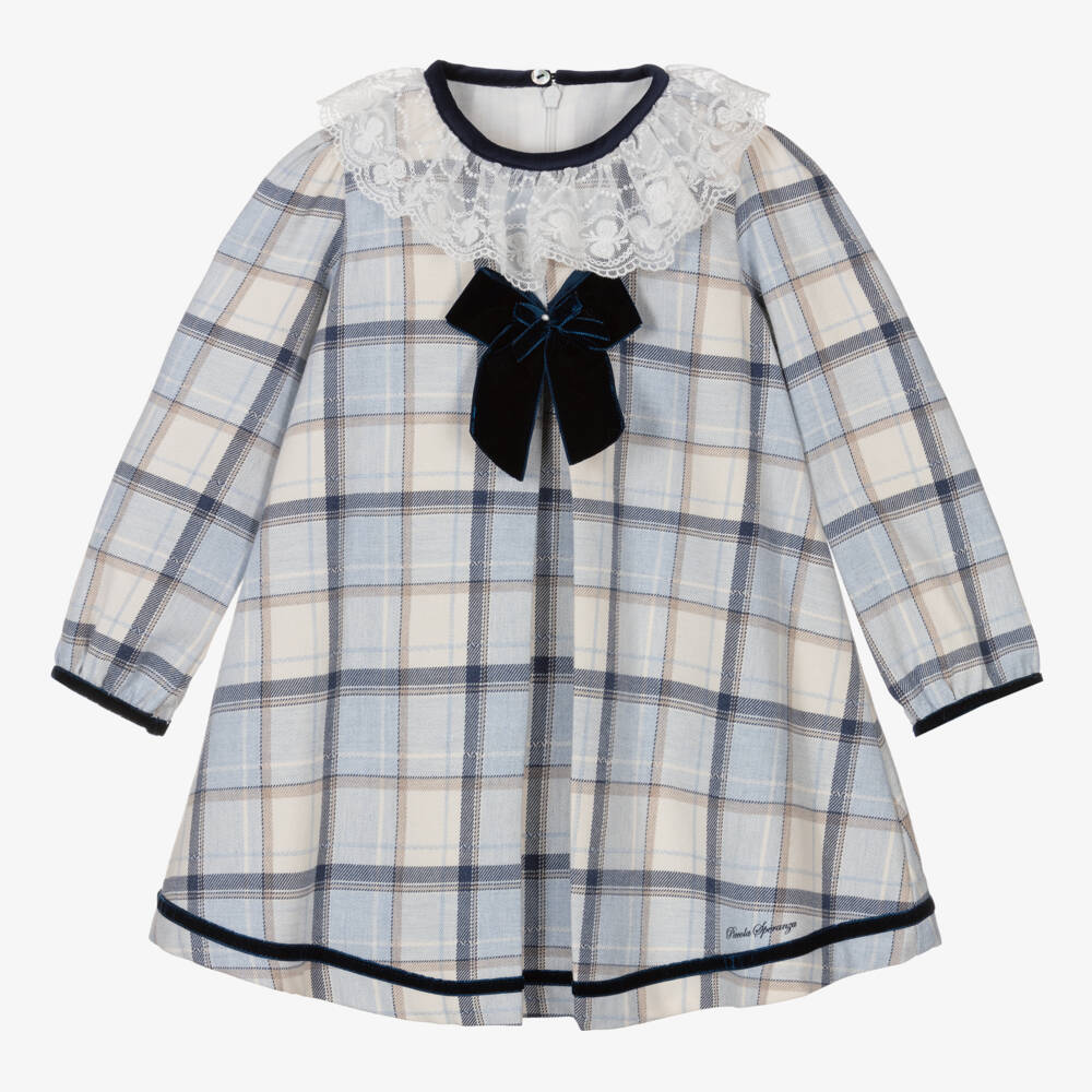 Beautiful blue and white tartan dress for girls from Piccola Speranza, made in soft cotton twill. This classic dress has an adorable scalloped lace collar, navy blue velvet piping and a matching bow on the front, embellished with a sparkling diamanté. With an inverted pleat on the front for a fuller shape, it is lined in a lightweight voile for comfort, and it fastens seamlessly with a zip on the back.