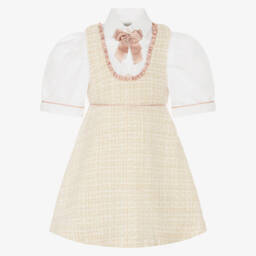 An adorable pink cotton dress set for little girls by Piccola Speranza, patterned with roses and gingham checks. Soft and lightweight, the sundress is elasticated around the top for easy dressing, with a pretty tie fastening on the back. The look is complete with sweet, bow-trimmed knickers and a lined sun hat with a pleated brim and ties for a secure fit.