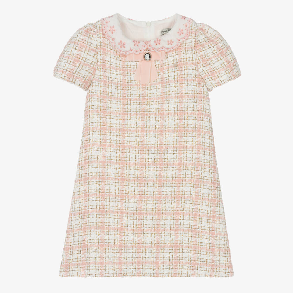 Lovely pink and ivory dress for girls by Piccola Speranza, made in soft tweed with a sparkly gold thread. This traditionally styled dress has a pretty broderie anglaise collar with pink trims and for added designer appeal, a mother-of-pearl logo charm is on the chest. It comes with a detachable pink velvet bow and cameo pin brooch for a classical look. This sweet dress fastens easily with a concealed zip at the back and is fully lined for comfort.