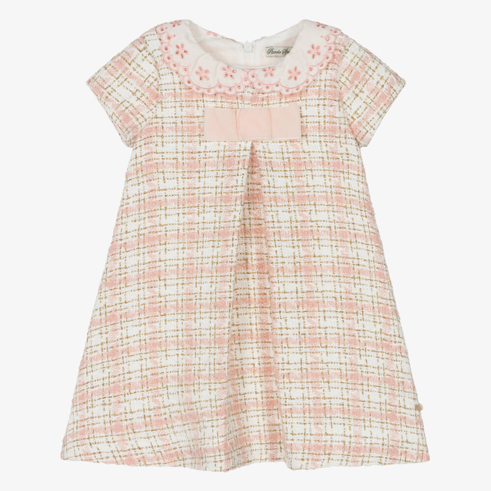 Lovely pink and ivory dress for girls by Piccola Speranza, made in soft tweed with a sparkly gold thread. This traditionally styled dress has a pink velvet bow and box pleat on the front and for added designer appeal, a mother-of-pearl logo charm is on the hem. It has a pretty broderie anglaise collar with pink trims and is fully lined for all-day comfort. This sweet dress fastens easily with a concealed zip at the back.