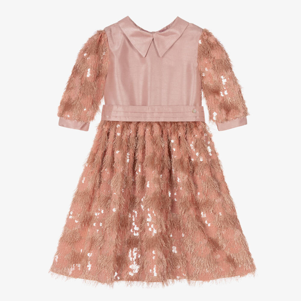 Special occasion dusky pink dress for little girls by Piccola Speranza. The bodice is made in a smooth satin and has a pointed collar and attached sash with a pretty bow on the back with button fastenings. It has coordinating satin cuffs and fastens at the back with pink pearlized buttons. The three-quarter length sleeves and full gathered skirt cascade beautifully with pink fringing and sparkling sequins for a glamorous effect. Fully lined in a lightweight, silky lining for comfort, it has a mother-of-pearl logo charm sewn on the waistband for a sweet designer touch
