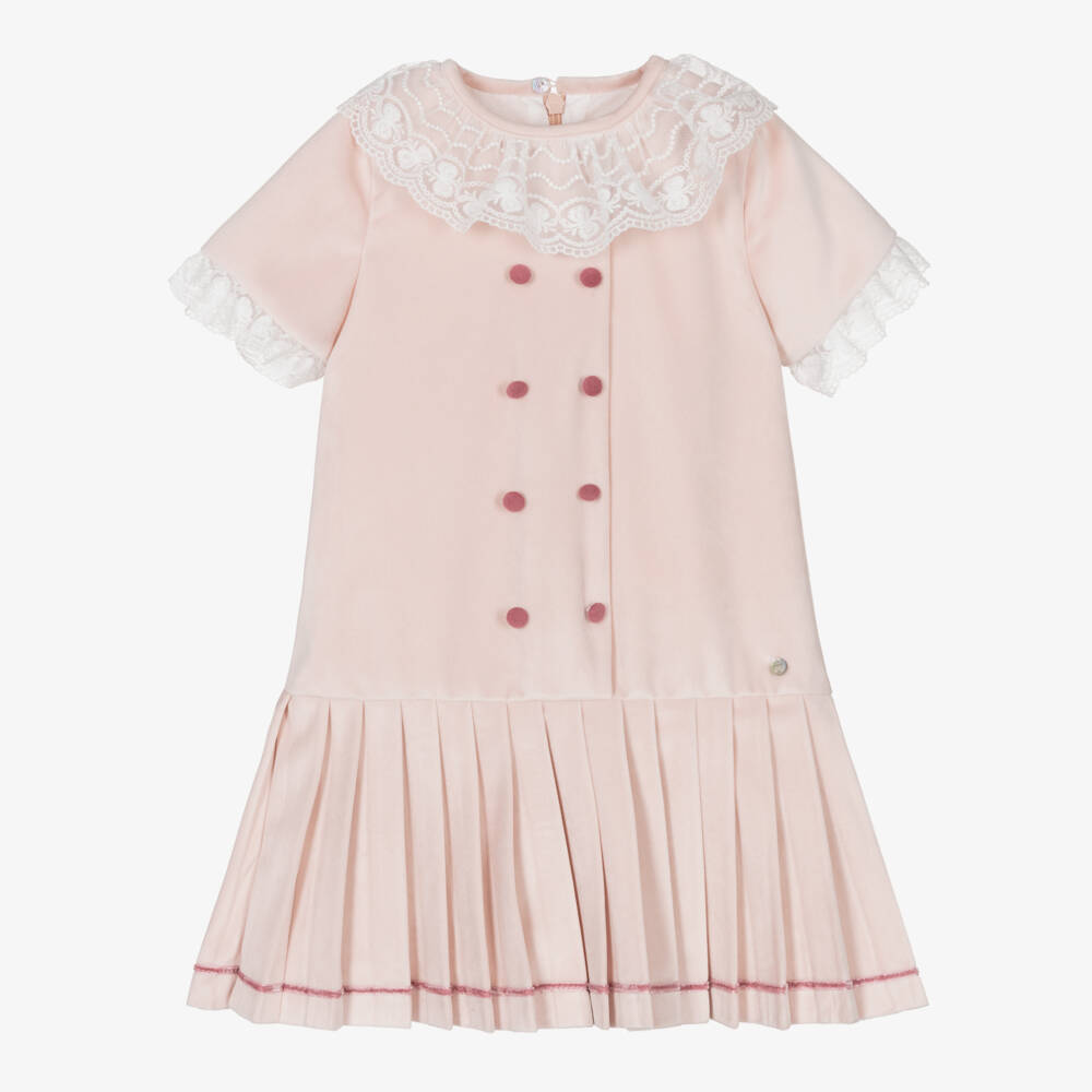 Lovely pale pink dress for little girls by Piccola Speranza, made in super soft velvet. Styled with a dropped waist, it has a pretty pleated hem for a traditional look. The scalloped ruffle collar is made in beautiful ivory lace, with matching lacy trim on the sleeves. For a sweet finish, the decorative buttons on the front are in a deeper shade of pink, with matching trim on the lower hemline. Fastening neatly with a concealed zip on the back, it is fully lined in a lightweight cotton voile for comfort.