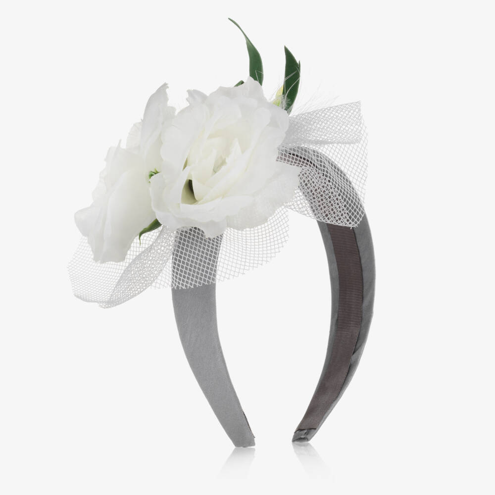 Stunning silver hairband for girls by Piccola Speranza, with a flexible fabric-covered band. Ideal for special occasions, it has a large ivory flower decoration on the top, trimmed with faux feathers, green leaves, and white netting.