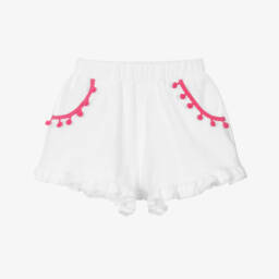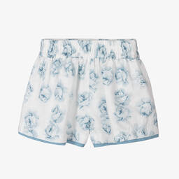 Pretty white shorts for girls by Piccola Speranza, made in a lightweight linen and cotton blend. Cool and easy wearing, they are patterned with a lovely blue floral print. They have contrast blue trims on the legs and an elasticated waist for a comfortable fit.
