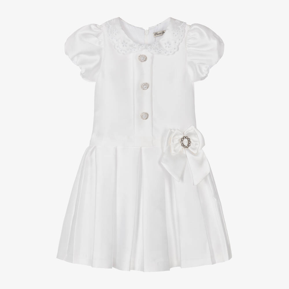 Beautiful white dress for girls by Piccola Speranza, ideal for special occasions. Luxuriously made in soft satin twill with a lustrous sheen, it has a timeless broderie anglaise-style collar and a glamorous brooch bow appliqué on the waist. The puffed, short sleeves and pearl diamanté buttons on the bodice add a chic touch to this smart style. Lined in soft cotton for comfort, it fastens with a concealed zip on the back for a neat finish.
