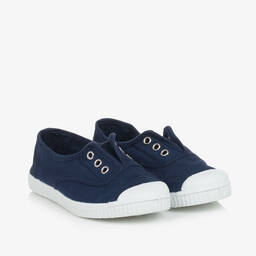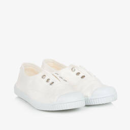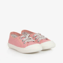 Blush pink canvas trainers for girls from Pisamonas, with reinforced toe-caps for durability. These slip-on shoes have elasticated inner panels for quick and easy dressing. The rubber soles are treaded for safety, the front is designed with eyelets for that classic look, and the Spanish label's cute monkey logo patch is stitched on the back.