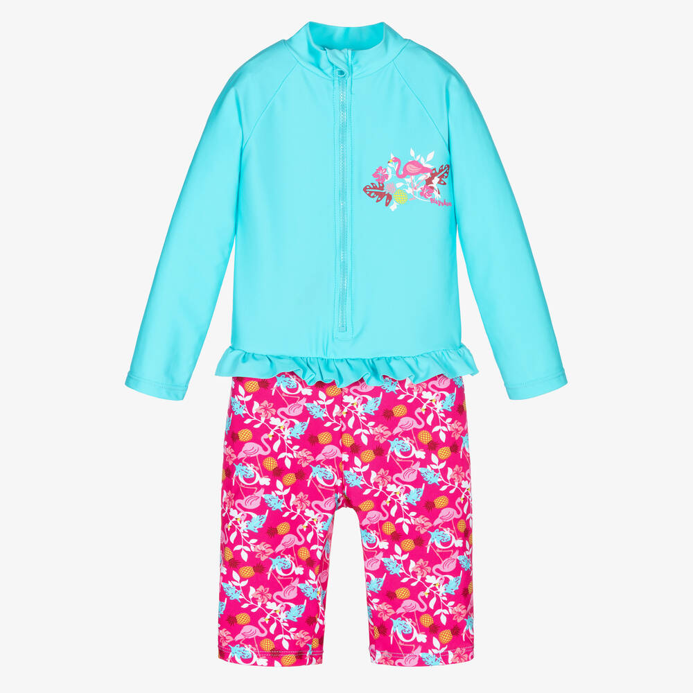 A fun blue and pink sun suit for little girls by German brand Playshoes, with UPF50+. Silky smooth and stretchy, the upper part has a cute flamingo motif on the chest, with a matching all-over flamingo print on the lower part. There is a ruffle trim around the waist, and an upper zip fastening on the front.