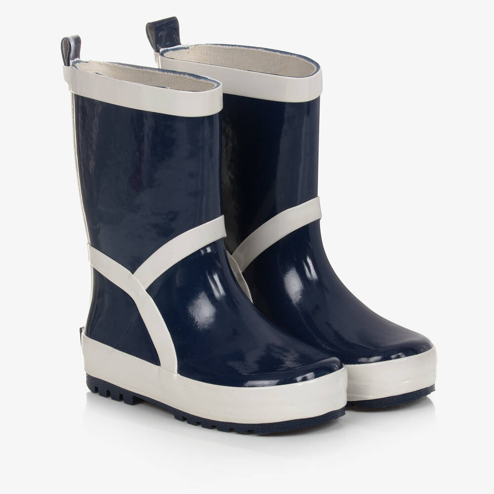 Navy blue rain boots for girls and boys by Playshoes, made from flexible rubber. Lined in soft textile, they have a padded inner sole for comfort, and a silver reflective patch on the back for safety during evening walks.