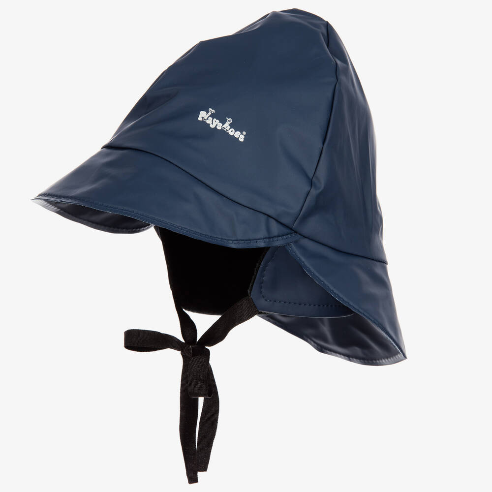 Navy blue rain hat by Playshoes, suitable for little boys and girls. Made with a waterproof coating and lined with cosy fleece, this hat has ear flaps and wide brims to help protect the face and neck against stormy weather. There are straps that tie under the chin to help keep the hat in place.