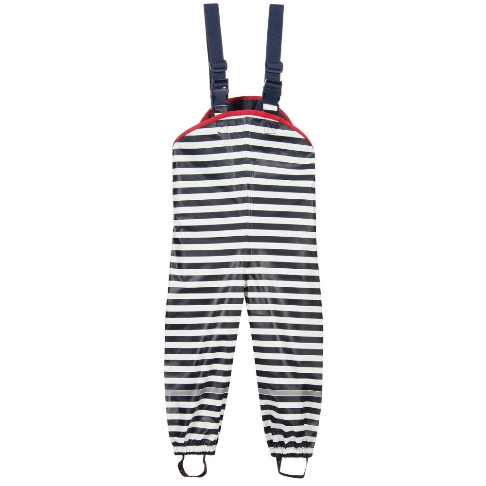 Suitable for boys and girls, a navy blue and white striped pair of salopettes by Playshoes, with fun red trims. Wind and waterproof, they have elasticated cuffs with removable boot straps. There are fully adjustable shoulder straps with clasp fastenings and red poppers on each side of the waist.
