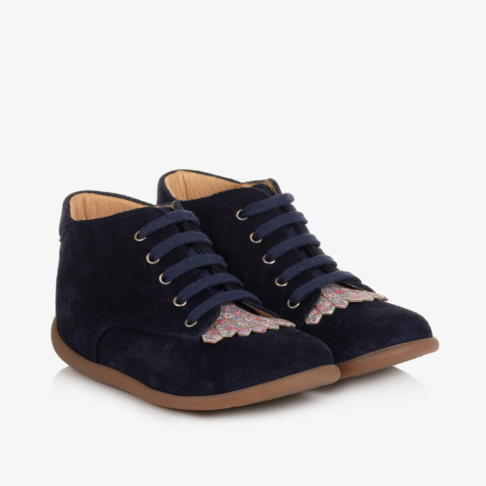 Navy blue suede first walker boots for girls by Pom d'Api, with a smooth leather lining. These lace-up shoes have a glittery silver and pink floral tassel trim, with a signature apple motif on the side. The rubber outsole is super flexible to support your little one during their first steps.