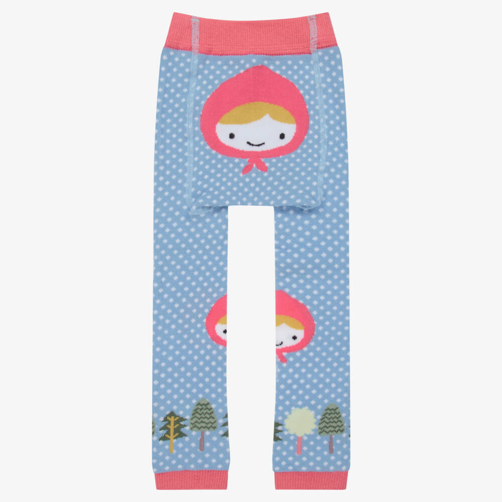 Little girls light blue leggings by Powell Craft, made in a soft cotton knit. They have colourful red riding hood girl motifs with blue and white spots and red trims. They are soft and stretchy, and can also be worn as footless tights.