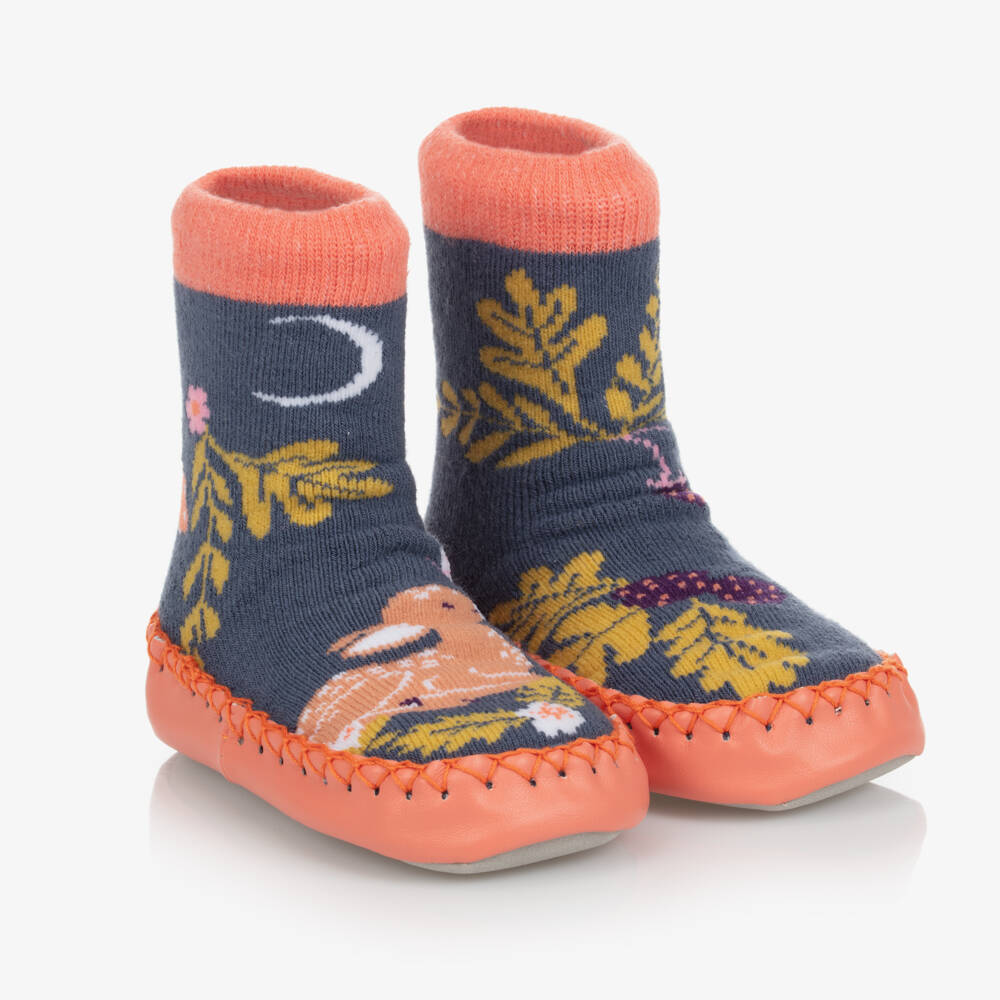 Navy blue and orange moccasin slipper socks for younger girls from Powell Craft. Great for keeping feet cosy, the base is made from non-slip faux leather and the cotton-rich socks have a forest animal, butterfly and leaf design in blue, beige and yellow.