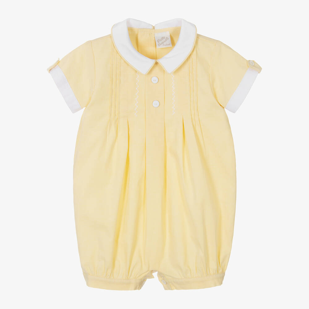 Yellow shortie for baby boys from British label Sarah Louise, with a lightweight part-lining. Woven in soft cotton, this traditional style has pin tucks, decorative buttons and hand-embroidery on the chest. With a smart collar, there are buttons to fasten on the back and between baby's legs for that classic look.