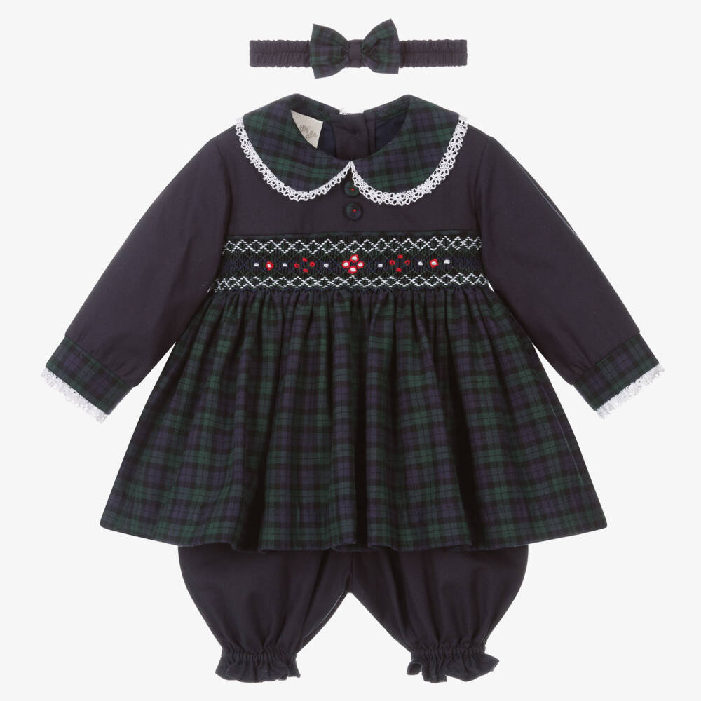 Traditionally styled navy blue and green tartan dress set for little girls, by British brand Pretty Originals. Made in a soft cotton blend, the dress has beautiful hand smocking across the bodice, with delicate hand-embroidered flowers. It has a sweet Peter Pan collar with lace trims and coordinated checked decorative buttons for a classic look. It is lined in soft lace-trimmed pleated fabric for a full shape. It fastens on the back with buttons and a fixed tie-up sash. Pair with the matching navy blue elasticated bloomers and tartan bow headband for a complete look.