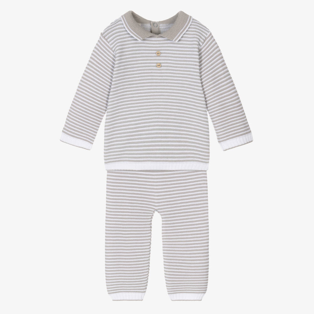 In a grey and white stripe, this sweet trouser set for little boys is by Pretty Originals. Casual and comfortable, it is knitted in soft cotton. The top has a pointed collar and decorative wooden buttons on the front, with easy fastening poppers on the back. The trousers have a ribbed elasticated waist for a comfortable fit.