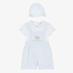 Traditional white and yellow dungarees set for little boys, by Pretty Originals. Woven in lightweight cotton, the yellow dungarees have adorable blue piped trims and an embroidered rocking horse motif on the bib front. They have an elasticated waist for comfort, and fasten with buttons on the straps and between the legs for easy dressing. Layered underneath, there is a white shirt with a pointed collar and matching piped trims. It fastens with buttons on the back for a classic look.