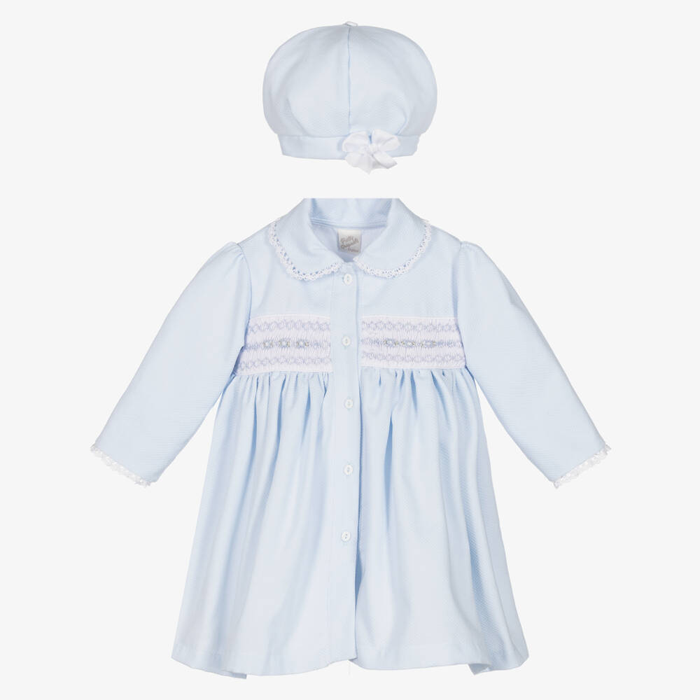 Pale blue coat and hat set for little girls by Pretty Originals, made in a waffle-textured cotton blend twill. This traditionally styled coat has hand-smocked and hand-embroidered panelling across the front and a fully gathered waist. The Peter Pan collar and cuffs are trimmed with lace and it has a grosgrain ribbon bow on the back for a pretty finish. Fully lined in lightweight voile for comfort, it fastens with buttons on the front. For a classic, coordinated look, it comes with a matching hat.