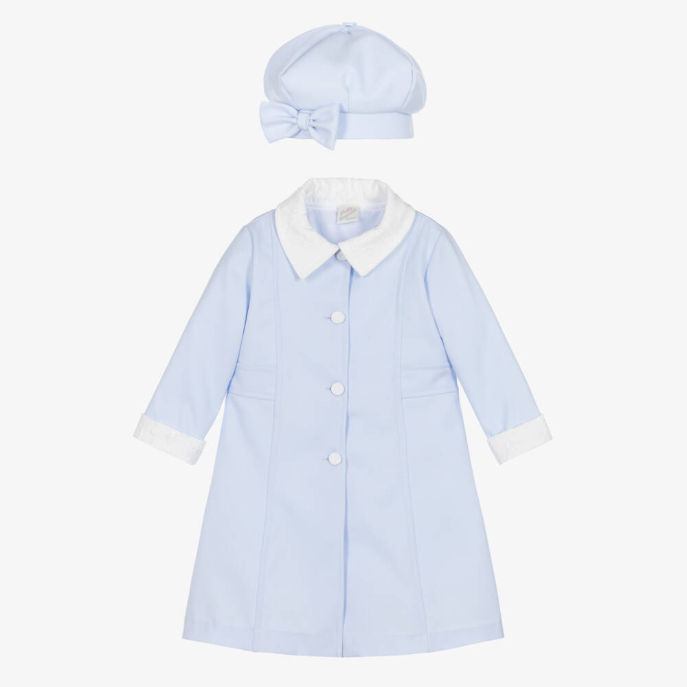 A lovely pale blue coat and hat set for little girls by Pretty Originals, made in mid-weight twill. This traditionally styled coat has beautiful lace overlays on the collar, cuffs and front button fastenings. It is fully lined for comfort with a silky soft lining. The back of the coat is pleated to give it a sweet feminine silhouette and for a finishing touch, it has a gorgeous attached bow. To complete the look, the matching hat is fully lined and has a pretty bow and elasticated back for a good fit.