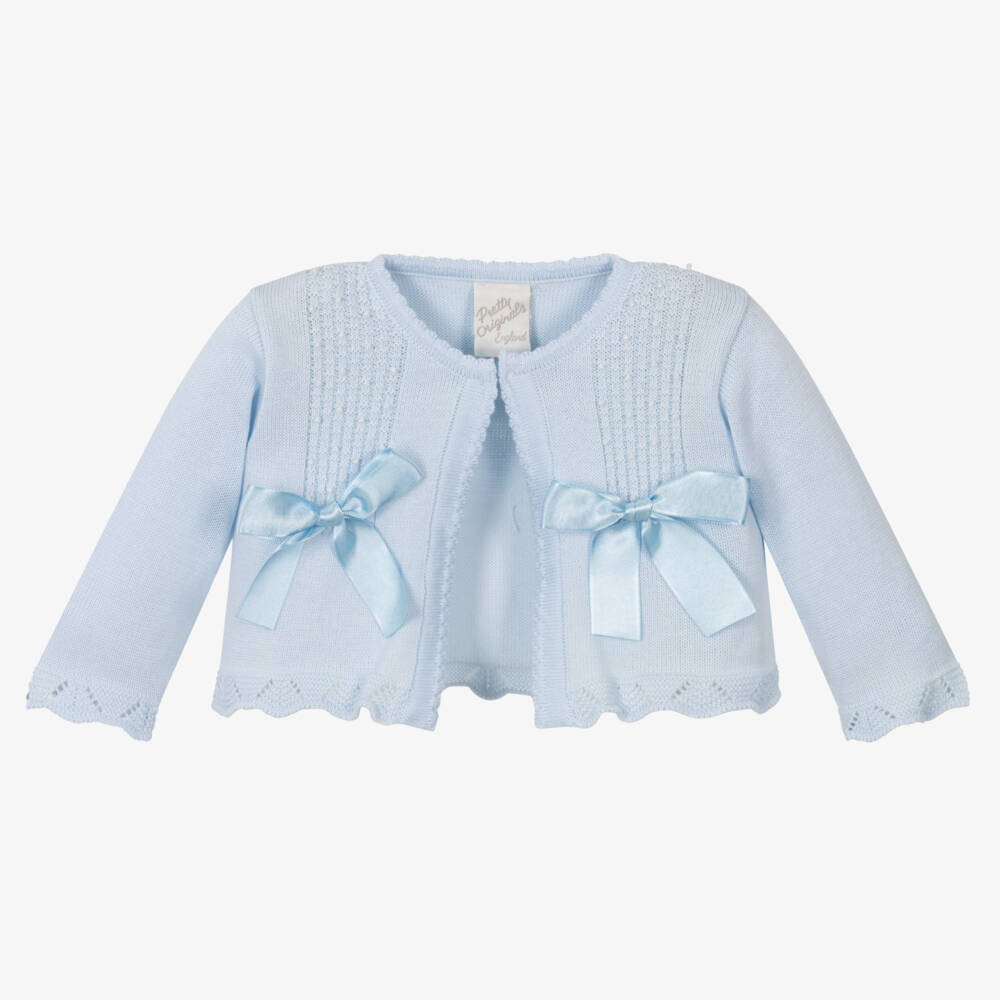 Lovely pale blue cotton cardigan for girls by Pretty Originals. Softly knitted, there are decorative satin bows stitched on the front and delicate cable knit detailing embellished with pearl beads. Fastening with a single button, it has scalloped trims, ideal for adding a pretty finishing touch to any outfit.