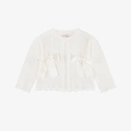 From Pretty Originals, a charming pink cardigan for girls knitted in soft cotton. A hidden button fastening gives a seamless finish to this lovely top which is embellished with faux pearls and two large ribbon bows.