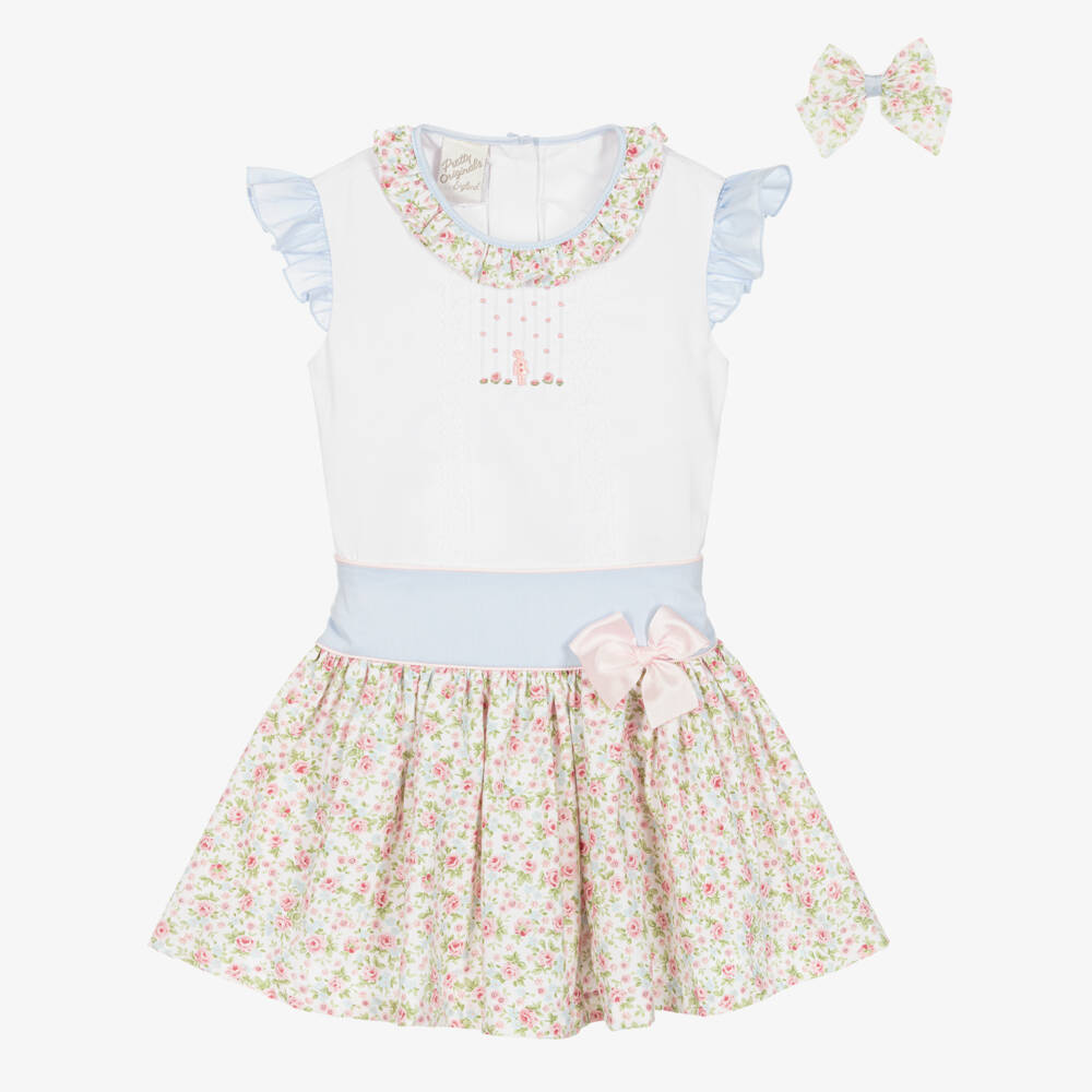 A white and ivory skirt set for girls by Pretty Originals, made from a soft and lightweight cotton blend. The blouse has an embroidered bodice with lace detailing and a little pink doll decoration for a lovely, traditional look. A frilly collar with a floral pattern complements the skirt and there are back button fastenings. The floral skirt has a lightweight lining and a gently elasticated waistband for comfort. This outfit comes with a cute matching hair clip to complete the look.