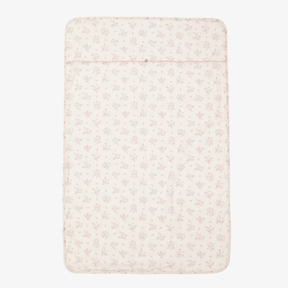 Lovely beige cotton blanket for baby girls by classic Portuguese brand Pureté Du... Bébé. It is made in soft plumetis poplin, patterned in pink flower sprigs, with a pink ric rac trim and a mother-of-pearl logo charm on one end. It is lined in soft, cosy, ivory velour.