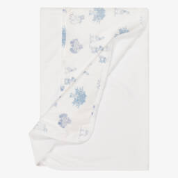 Beautiful white blanket for baby girls by Pureté Du... Bébé, made in soft cotton jersey with a delightful voile panel across the top, patterned in a pale blue, toile de jouy design. Sweet pintuck detailing and a mother-of-pearl logo charm add the finishing touches. Ideal for use in the pram or car seat, it also makes a lovely nursery accessory.