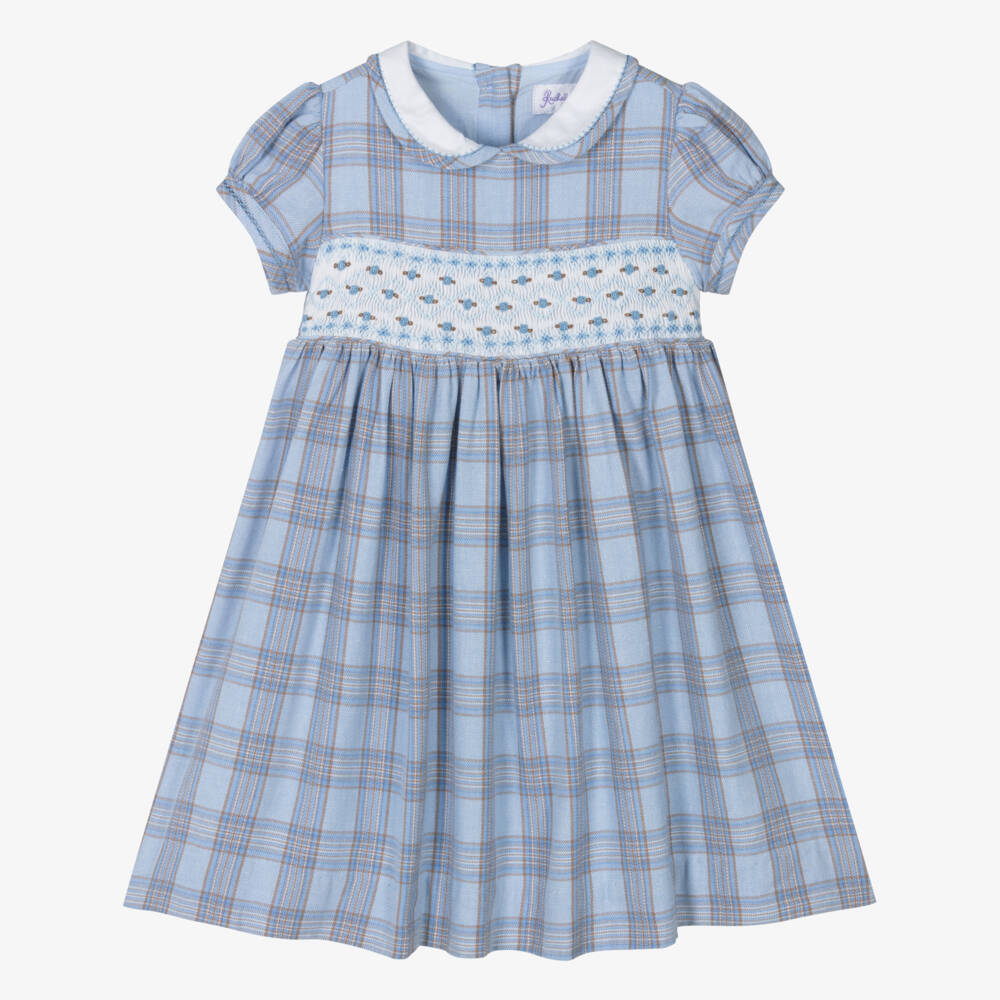Beautiful blue check dress for baby girls by British designer, Rachel Riley. Woven in lightweight cotton for gentle comfort, it has a delicately hand-smocked panel across the bodice with sweet blue rosebuds. The puffed sleeves and hand-embroidered peter pan collar complement this traditional style. Lined in soft cotton, this pretty dress fastens with classic buttons on the back. Elasticated knickers complete the heritage look.